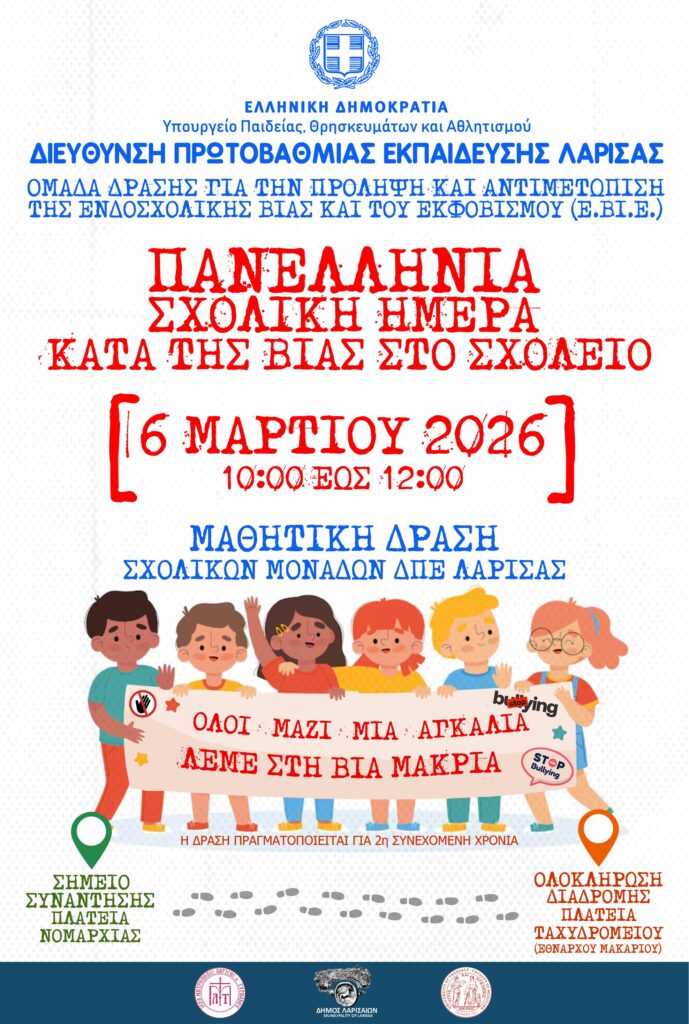 Η Διεύθυνση Πρωτοβάθμιας ΕκπαίδευσηςΛάρισας και η Ομάδα Δράσης τηςγια την Πρόληψη και Αντιμετώπιση της Ενδοσχολικής Βίας και του Εκφοβισμού (Ε.ΒΙ.Ε.), σε συνεργασία με την Ιερά Μητρόπολη Λαρίσης και Τυρνάβου, τον Δήμο Λαρισαίων και το Τμήμα Ιατρικής του Πανεπιστημίου Θεσσαλίας, διοργανώνει τη μαθητική εκδήλωση με τίτλο: «Όλοι μαζί μια αγκαλιά, λέμε στη βία “μακριά”»,την Παρασκευή 6/3/2026 και ώρες10:00 π.μ.-12:00μ.