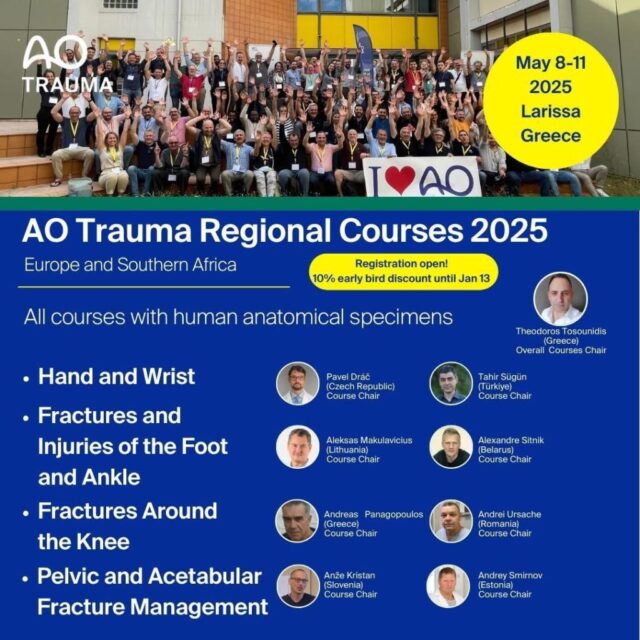 Το παράρτημα της ΑΟ της Ανατολικής και Νότιας Ευρώπης (ΑΟ TESA MID) το οποίο περιλαμβάνει 22 χώρες και η ΑΟ Τραύμα Ελλάδος (AO Trauma Greece), διοργανώνουν τα 4 ετήσια περιοδικά συνέδρια για την αντιμετώπιση του πολύπλοκου μυοσκελετικού τραύματος, από 8 έως 11 Μαΐου 2025, στη Λάρισα, στις εγκαταστάσεις του Εργαστηρίου Ανατομίας του Τμήματος Ιατρικής του Πανεπιστημίου Θεσσαλίας.