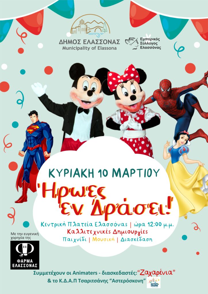 Ο Δήμος Ελασσόνας, στο πλαίσιο των Αποκριάτικων εκδηλώσεων, διοργανώνει στην Κεντρική Πλατεία της Ελασσόνας την Κυριακή της Μικρής Αποκριάς, 10 Μαρτίου και ώρα 12:00, την παιδική εκδήλωση «Ήρωες εν δράσει», παρασύροντας τα παιδιά στον κόσμο των παραμυθιών και των αγαπημένων τους ηρώων.