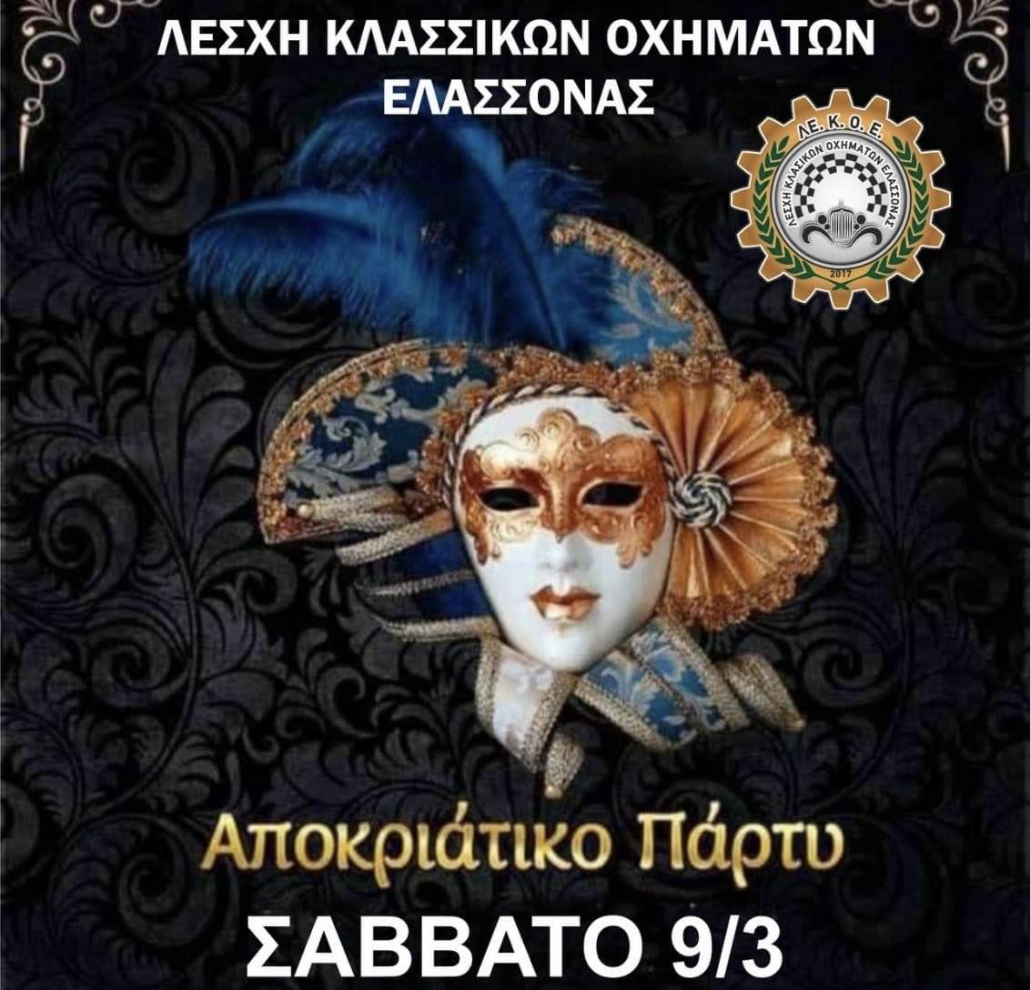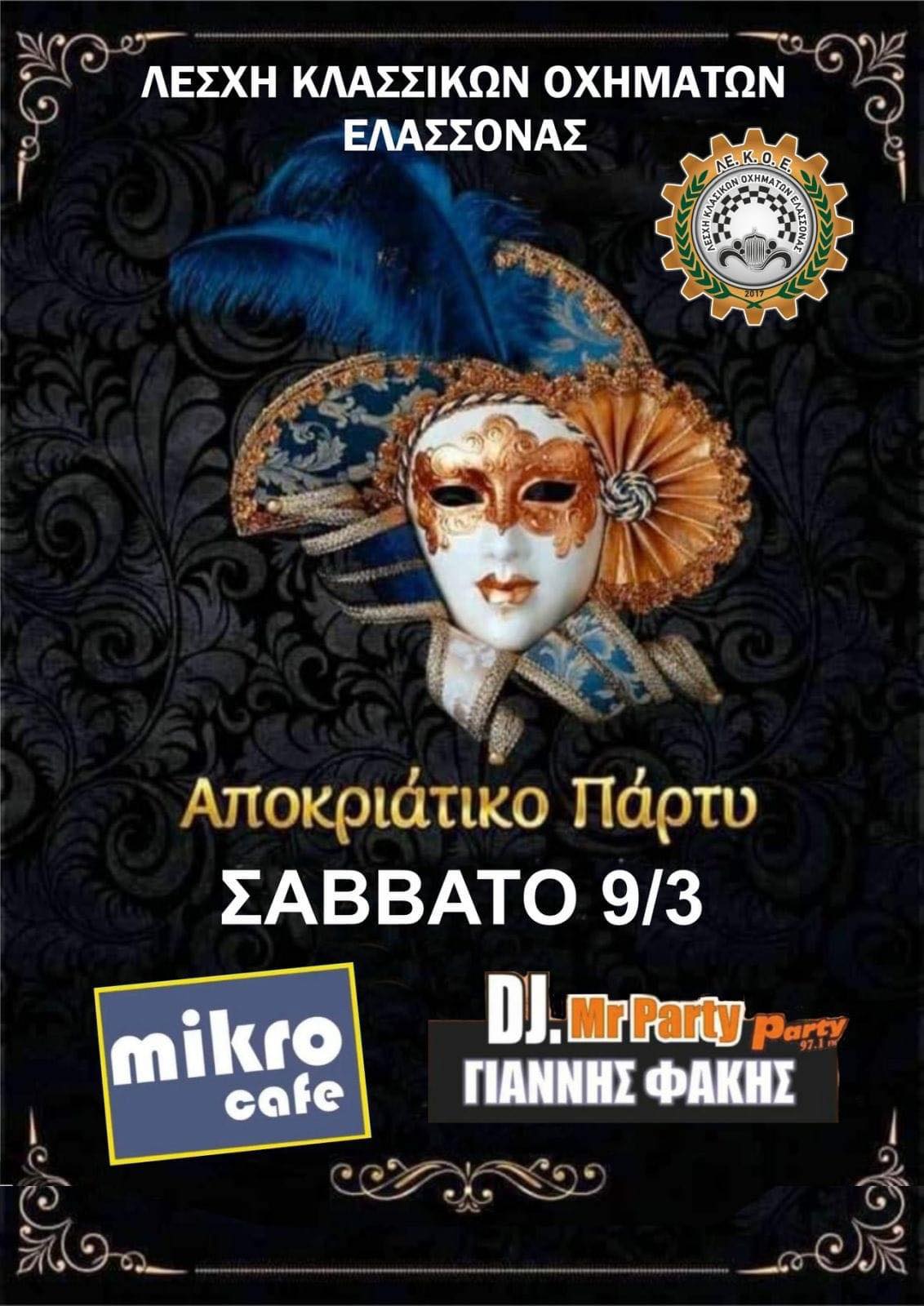 Η Λέσχη Κλασσικών Οχημάτων Ελασσόνας διοργανώνει ένα μοναδικό Αποκριάτικο Party το Σάββατο 9 Μαρτίου στο Mikro cafe. Διασκεδάζουμε σε ρυθμούς καρναβαλιού σε ένα original Masque event με τραγούδια που αγαπήσαμε και συνεχίζουμε να αγαπάμε !! Ώρα έναρξης : 22.00, D.j Mr.Party: Γιάννης Φακής.