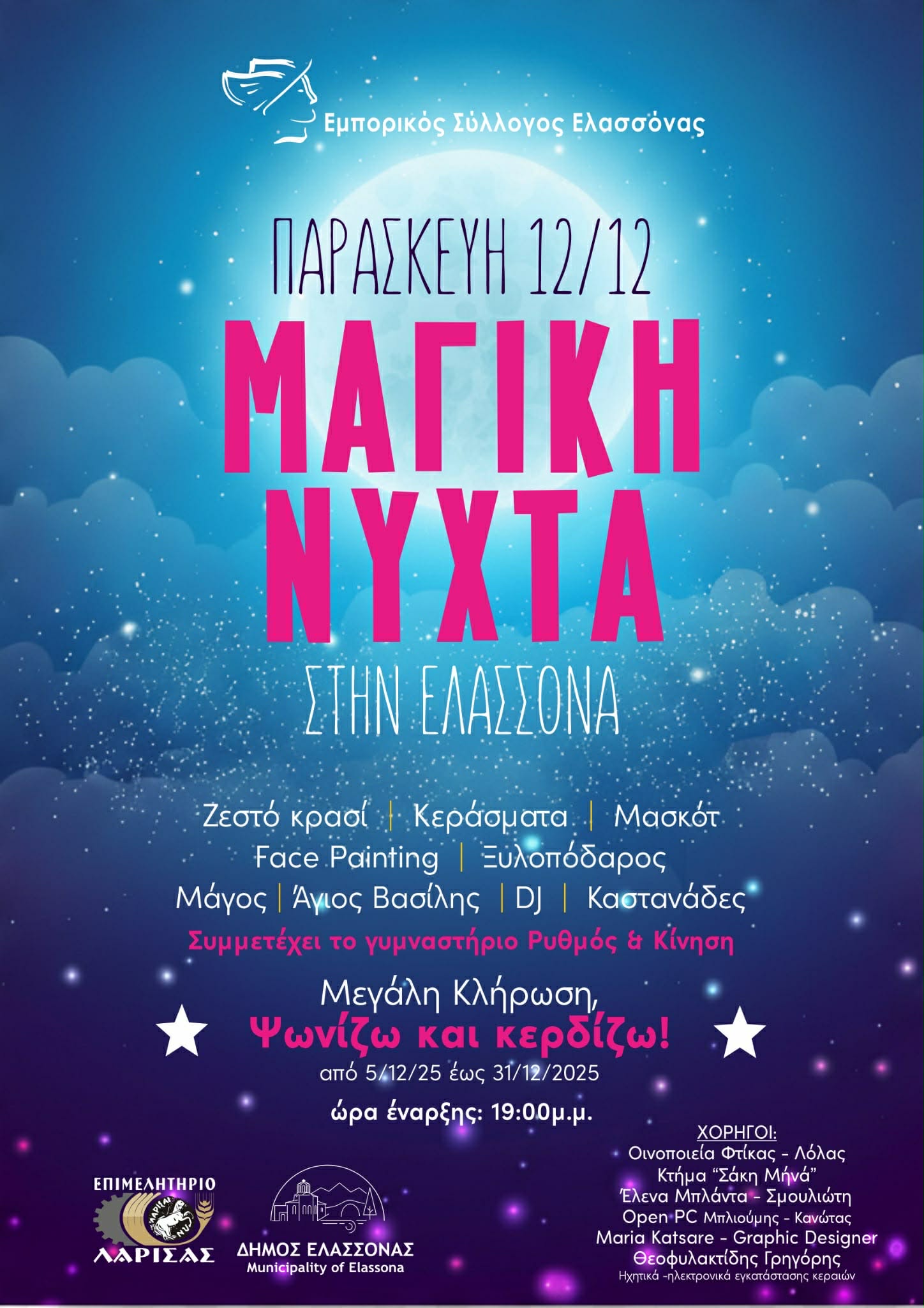 Ο Εμπορικός Σύλλογος Ελασσόνας αναφέρει: Στην καρδιά της Ελασσόνας, εκεί όπου οι δρόμοι φωτίζονται και οι ευχές ταξιδεύουν στον χειμωνιάτικο αέρα, ανοίγει μια γιορτινή νύχτα βγαλμένη από χριστουγεννιάτικο παραμύθι.