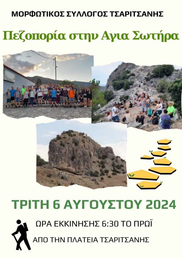 Πεζοπορία στην Αγια-Σωτήρα την Τρίτη 6 Αυγούστου διοργανώνει ο Μορφωτικός Σύλλογος Τσαριτσάνης.