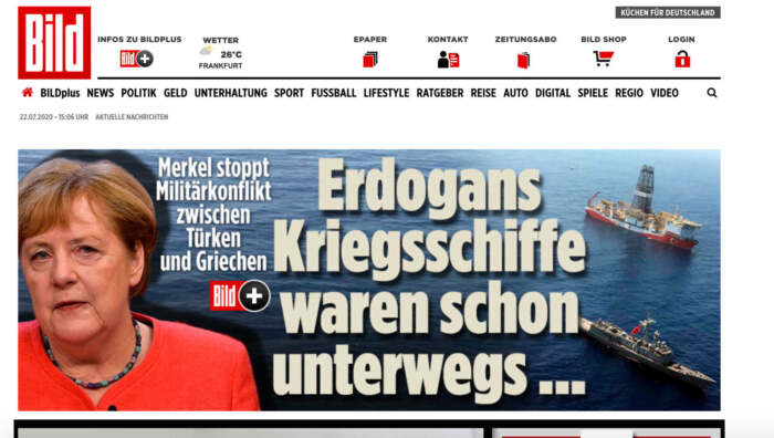 «Μετά ήρθε η Μέρκελ» αναφέρει η Bild, υπογραμμίζοντας ότι η Γερμανίδα καγκελάριος είχε τηλεφωνικές επαφές, την τελευταία στιγμή, με τον Τούρκο πρόεδρο Ρετζέπ Ταγίπ Ερντογάν και με τον Ελληνα πρωθυπουργό Κυριάκο Μητσοτάκη. Οι επαφές ολοκληρώθηκαν «με επιτυχία!» προσθέτει ο αρθρογράφος. Ο τουρκικός στόλος γύρισε και κατευθύνθηκε προς άλλη κατεύθυνση, εξηγεί.