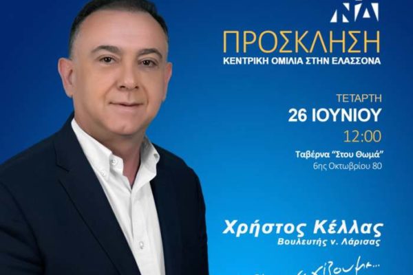 Ο βουλευτής ΝΔ Ν.Λάρισας, Χρήστος Κέλλας,σας προσκαλεί στη κεντρική ομιλία του στην Ελασσόνα,την Τετάρτη 26/6 στις 12 το μεσημέρι.
