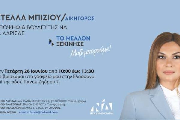 Από το πολιτικό γραφείο της υποψήφιας βουλευτή ΝΔ κ. Στέλλας Μπίζιου ανακοινώνεται το εξής: Την Τετάρτη 26 Ιουνίου από 10:00 …