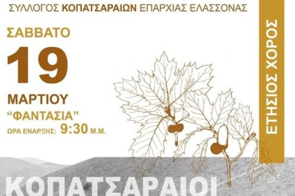 Ο Σύλλογος Κοπατσαραίων Επαρχίας Ελασσόνας πραγματοποιεί τον ετήσιο χορό του αύριο Σάββατο 19 Μαρτίου στο κέντρο “Φαντασία” στην Ελασσόνα. Θα …