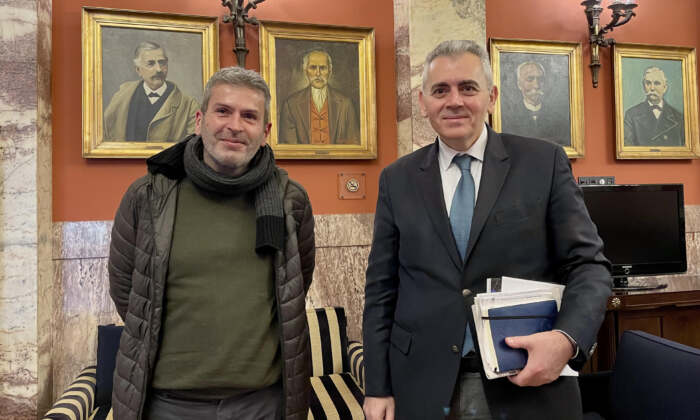 Φωτ. Ο Μάξιμος Χαρακόπουλος με τον Βασίλη Καραμπάτσα, υπεύθυνο πολιτιστικών δραστηριοτήτων την Ελληνικής Κοινότητας Σικελίας “Τρινακρία”.