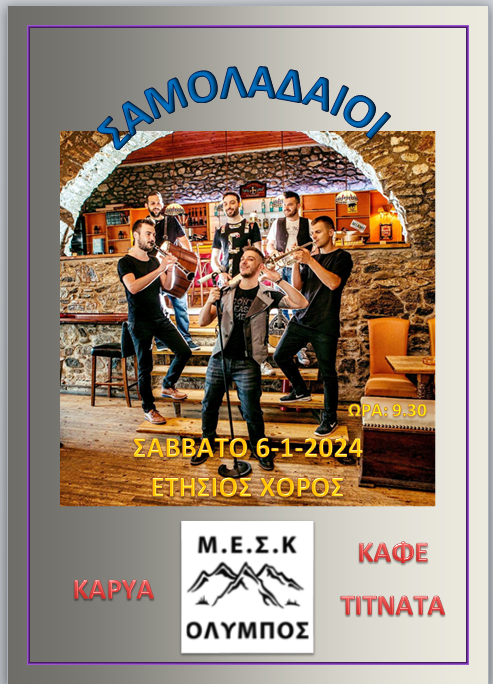 Ο Μορφωτικός Σύλλογος Καρυάς Ελασσόνας σας διοργανώνει τον ετήσιο χορό του που θα γίνει στην Καρυά στο κατάστημα “Τιτνάτα”, στις 6 ιανουαρίου 2024, ανήμερα των Φώτων, με την παραδοσιακή ορχήστρα των Σαμολαδαίων.