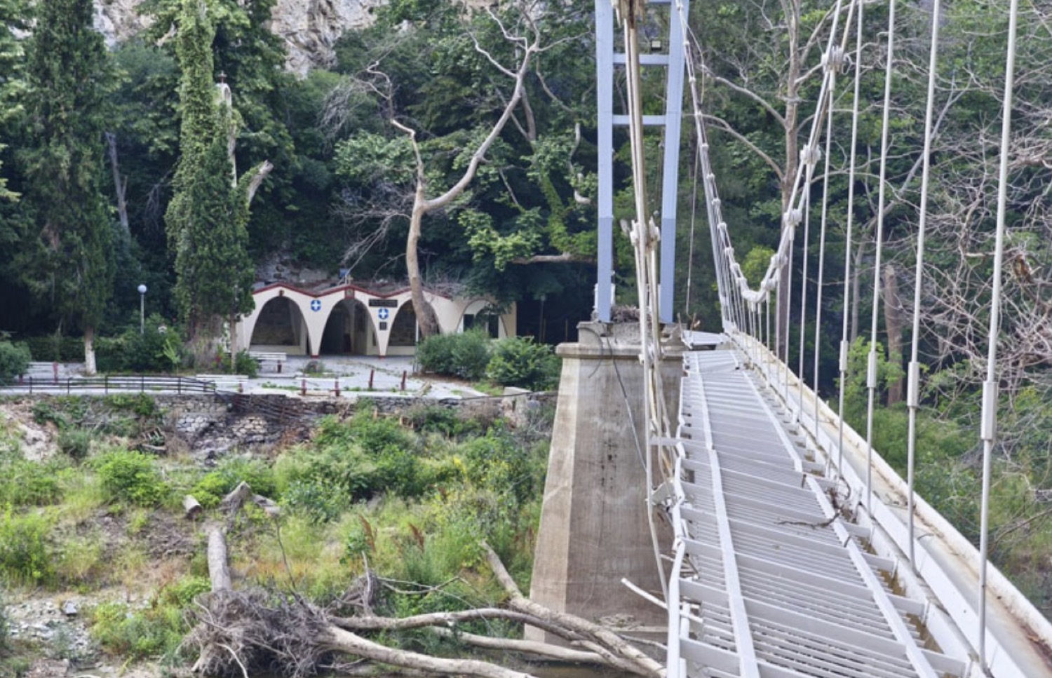 Για δεύτερο συνεχόμενο καλοκαίρι, η Αγία Παρασκευή στα Τέμπη παραμένει απρόσιτη – η πεζογέφυρα του 1960 που ένωνε τον δρόμο με το εκκλησάκι έχει καταστραφεί από την κακοκαιρία “Daniel” του Σεπτεμβρίου 2023, αφήνοντας μόνο κάποια συρματόσχοινα να αιωρούνται πάνω από τον Πηνειό.