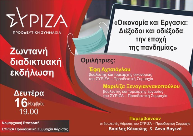 Η Νομαρχιακή Επιτροπή ΣΥΡΙΖΑ – Προοδευτική Συμμαχία Λάρισας διοργανώνει ζωντανή διαδικτυακή εκδήλωση με θέμα «Οικονομία και Εργασία: Διέξοδοι και αδιέξοδα την εποχή της πανδημίας», την Δευτέρα 16 Νοεμβρίου 2020, στις 7 το απόγευμα.