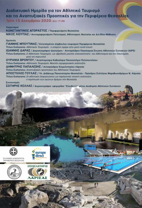 Η Περιφέρεια Θεσσαλίας, το Κέντρο Ευρωπαϊκής Πληροφόρησης  Europe Direct Θεσσαλίας, το Επιμελητήριο Λάρισας και ο Σύλλογος Μαραθωνοδρόμων ν. Λάρισας διοργανώνουν διαδικτυακή ημερίδα  με θέμα «Αθλητικός Τουρισμός και οι Αναπτυξιακές Προοπτικές για την Περιφέρεια Θεσσαλίας», την Τρίτη 15 Δεκεμβρίου 2020 και ώρα 5 μ.μ.  Οι ενδιαφερόμενοι μπορούν να παρακολουθήσουν την εκδήλωση ζωντανά στο  Υoutube, στο link http://www.larissa-chamber.gr/