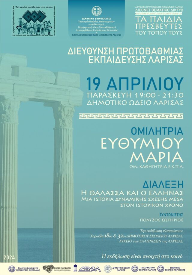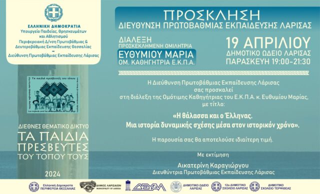 Η Διεύθυνση Πρωτοβάθμιας Εκπαίδευσης Λάρισας προσκαλεί το σύνολο της εκπαιδευτικής κοινότητας και το κοινό της Λάρισας, στη διάλεξη της Ομότιμης Καθηγήτριας του Εθνικού και Καποδιστριακού Πανεπιστημίου Αθηνών και διακεκριμένης Ιστορικού, κ. Ευθυμίου Μαρίας, με θέμα: «Η θάλασσα και ο Έλληνας. Μία ιστορία δυναμικής σχέσης μέσα στον ιστορικό χρόνο», η οποία θα πραγματοποιηθεί στο Δημοτικό Ωδείο Λάρισας, την Παρασκευή 19 Απριλίου 2024 και ώρα 7:00-9:30 μ.μ..
