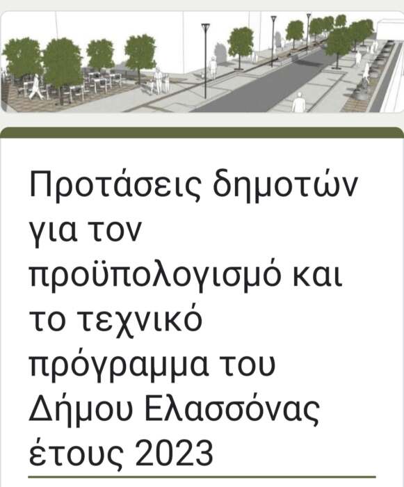 Για ακόμα μια φορά, ο Δήμος Ελασσόνας ζητά την ενεργή συμμετοχή των δημοτών στη λήψη αποφάσεων, με καινοτόμο τρόπο, ώστε να βελτιωθεί η εικόνα του δήμου αλλά και η ποιότητα ζωής των πολιτών.