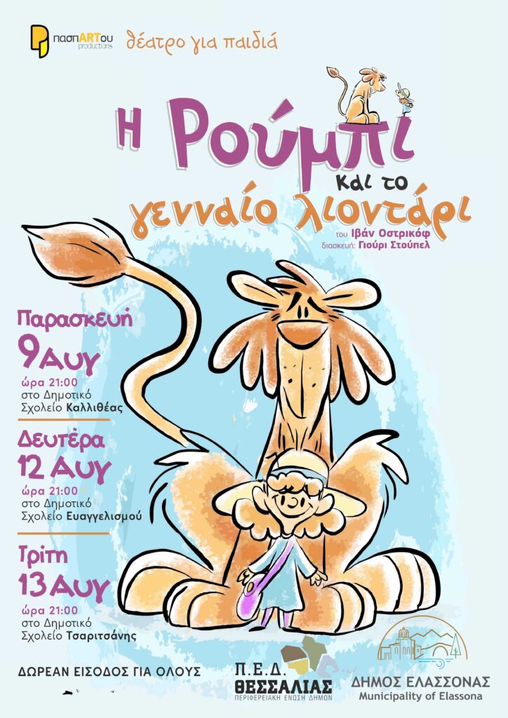 Δωρεάν παιδικές θεατρικές παραστάσεις έχει προγραμματίσει ο Δήμος Ελασσόνας τις επόμενες ημέρες στα προαύλια των δημοτικών σχολείων Καλλιθέας, Ευαγγελισμού και Τσαριτσάνης, με το έργο «Η Ρούμπι και το γενναίο λιοντάρι», από την θεατρική ομάδα «Πασπαρτού», σε συνδιοργάνωση με την ΠΕΔ Θεσσαλίας.