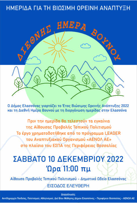 Με την ευκαιρία των εγκαινίων της αίθουσας η Αντιδημαρχία Πολιτισμού του Δήμου Ελασσόνας, η Περιφέρεια Θεσσαλίας και η ΑΕΝΟΛ ΑΕ διοργανώνουν αμέσως μετά στις 10/12/2022 και ώρα 12:00 ενημερωτική ημερίδα με θέμα «2022 Έτος Βιώσιμης Ορεινής Ανάπτυξης και Διεθνής Ημέρα Βουνού» με αφορμή την κήρυξη του 2022 ως έτους Βιώσιμης Ορεινής Ανάπτυξης και της Διεθνούς Ημέρας Βουνού, η οποία γιορτάζεται κάθε χρόνο στις 11 Δεκεμβρίου.
