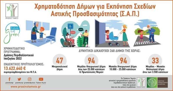 Σε συνέχεια της πρόσκλησης αυτής ο Δήμος μας χρηματοδοτήθηκε για την δράση με τίτλο «Εκπόνηση Σχεδίου Αστικής Προσβασιμότητας (Σ.Α.Π.) στο Δήμο Ελασσόνας», προϋπολογισμού 49.600,00 € συμπεριλαμβανομένου Φ.Π.Α. 24% η οποία εγκρίθηκε με την υπ’ αριθ. 240.3.1/2022 Απόφαση του ΔΣ του Πράσινου Ταμείου (ΑΔΑ: 9ΨΘΤ46Ψ844-97Δ).