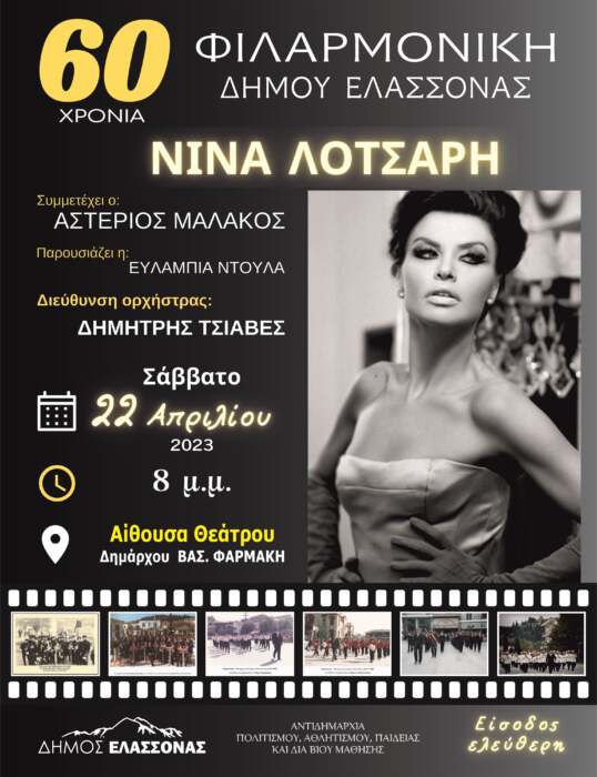 Με τη συμπλήρωση 60 χρόνων από την ίδρυση της Φιλαρμονικής του Δήμου Ελασσόνας η Αντιδημαρχία Πολιτισμού, Αθλητισμού, Παιδείας και Διά βίου Μάθησης του Δήμου Ελασσόνας διοργανώνει στις 22 Απριλίου 2023 μεγάλη επετειακή συναυλία αντάξια της ιστορίας της ορχήστρας.