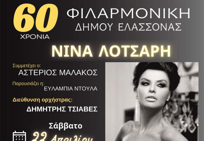 Στην επετειακή συναυλία η Φιλαρμονική του Δήμου Ελασσόνας υπό τη διεύθυνση του μαέστρου Δημήτρη Τσιαβέ συμπράττει με τη διάσημη ερμηνεύτρια Νίνα Λοτσάρη σε ένα πλούσιο ρεπερτόριο από την ξένη και ελληνική μουσική σκηνή. Η συναυλία θα πραγματοποιηθεί το Σάββατο 22 Απριλίου 2023 και ώρα 8 μ.μ. στην αίθουσα θεάτρου Δημάρχου Βασ. Φαρμάκη στην Ελασσόνα. Η είσοδος θα είναι ελεύθερη.