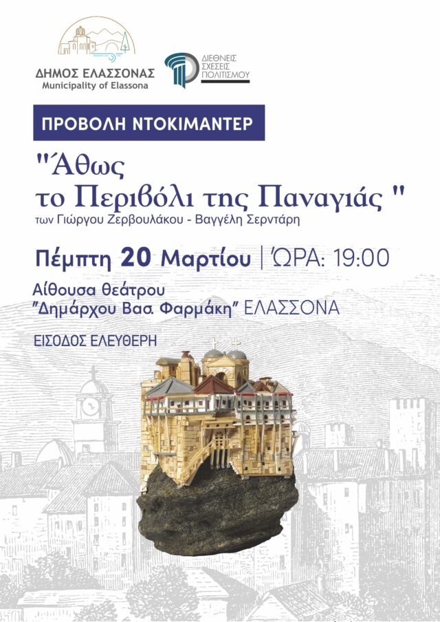 Το ντοκιμαντέρ των Γιώργου Ζερβουλάκου και Βαγγέλη Σερντάρη με τίτλο “Άθως: Το Περιβόλι της Παναγιάς” θα προβληθεί από το Δήμο Ελασσόνας την Πέμπτη 20 Μαρτίου και ώρα 19:00 με δωρεάν είσοδο για το κοινό.