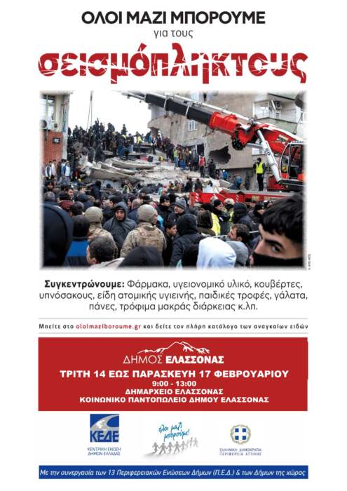 Στην πρωτοβουλία της Κεντρικής Ένωσης Δήμων Ελλάδος θα συμμετάσχει ο Δήμος Ελασσόνας, αναλαμβάνοντας πρωτοβουλία για τη συγκέντρωση ανθρωπιστικής βοήθειας για τους πληγέντες από το σεισμό στην Τουρκία και τη Συρία.