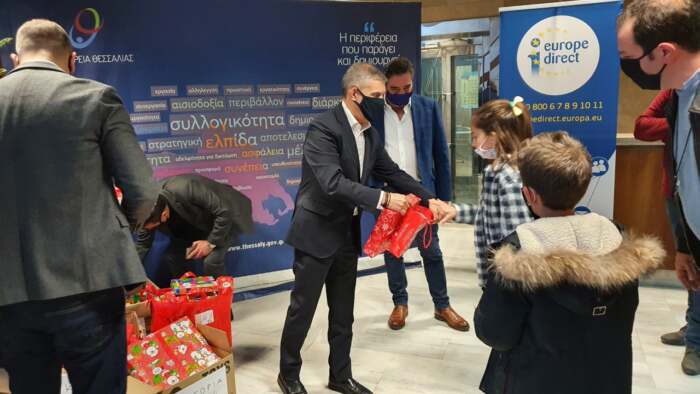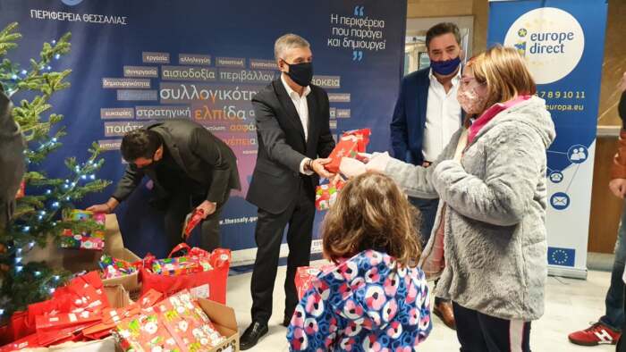 Τα πρωτοχρονιάτικα δώρα μαζί με ευχές για καλή χρονιά μοίρασε ο Περιφερειάρχης Θεσσαλίας Κώστας Αγοραστός στα παιδιά των εργαζομένων στην Περιφέρεια.