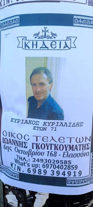 Απεβίωσε σε ηλικία 71 ετών ο Κυριάκος Κυριλλίδης σκορπίζοντας θλίψη στην κοινωνία της Ελασσόνας.