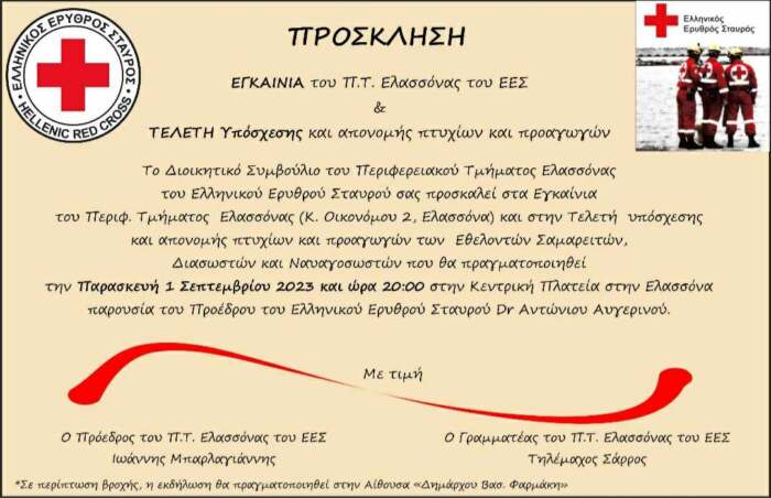 Το Διοικητικό Συμβούλιο του Περιφερειακού Τμήματος Ελασσόνας του Ελληνικού Ερυθρού Σταυρού, σας προσκαλεί στα εγκαίνια του Περιφερειακού Τμήματος Ελασσόνας (Κ. Οικονόμου 2, Ελασσόνα) και στην Τελετή υπόσχεσης και απονομής πτυχίων και προαγωγών των Εθελοντών Σαμαρειτών, Διασωστών και Ναυαγοσωστών που θα πραγματοποιηθεί την Παρασκευή 1 Σεπτεμβρίου 2023 και ώρα 20:00 στη κεντρική πλατεία Ελασσόνας, παρουσία του προέδρου του Ελληνικού Ερυθρού Σταυρού Dr Αντώνιου Αυγερινού.