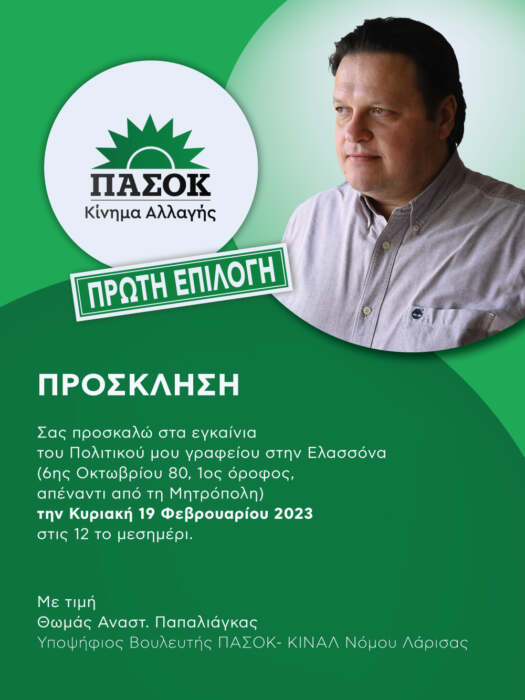 Εγκαινιάζεται το πολιτικό γραφείο υ του Θωμά Παπαλιάγκα στην Ελασσόνα
