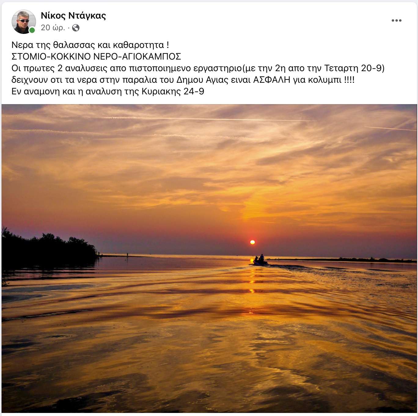 Με ανάρτησή του, ο αντιδήμαρχος Αγιάς κ. Νίκος Ντάγκας ωστόσο, επικαλείται μετρήσεις από πιστοποιημένο εργαστήριο, οι οποίες δείχνουν πως τα νερά στα παράλια του Δήμου Αγιάς είναι κατάλληλα για κολύμβηση.