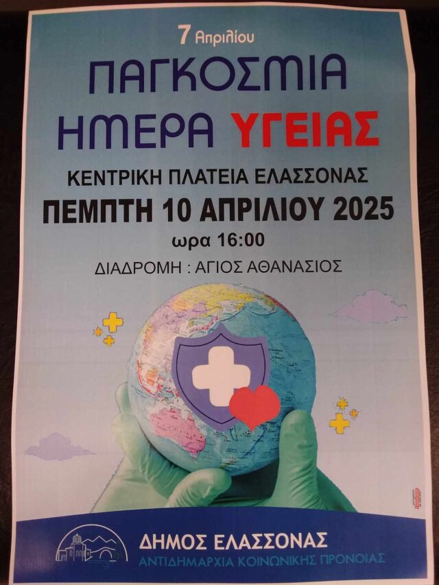 Η Αντιδημαρχία Κοινωνικής Πρόνοιας του Δήμου Ελασσόνας με αφορμή την Παγκόσμια Ημέρα Υγείας, διοργανώνει την Πέμπτη 10 Απριλίου δράσεις ενημέρωσης και ευαισθητοποίησης για τους πολίτες.