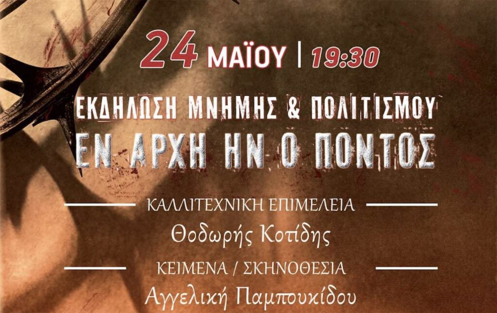 Η εκδήλωση με τίτλο « Εν αρχή ην ο Πόντος» σκοπό έχει να τιμήσει τα 106 χρόνια από τη θλιβερή επέτειο της γενοκτονίας του Ποντιακού Ελληνισμού, με μια μουσικό αφηγηματική, χορευτική και χορωδιακή δραματική παράσταση, την καλλιτεχνική επιμέλεια της οποίας υπογράφει ο κ. Θεόδωρος Κοτίδης, με κείμενα και σκηνοθεσία της κ. Αγγελικής Παμπουκίδου, ενώ θα εμφανιστούν οι κ.κ. Μελίνα Χατζηκαμάνου, Αλεξία κοτίδου, Γιάννης Παπαχατζάκης και Ανδρέας Ανδρεάδης.