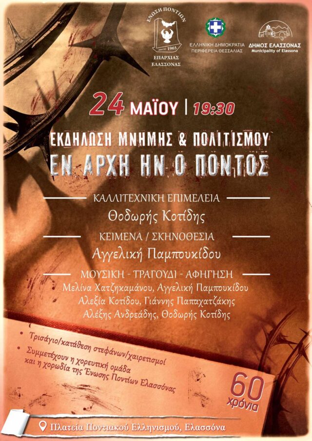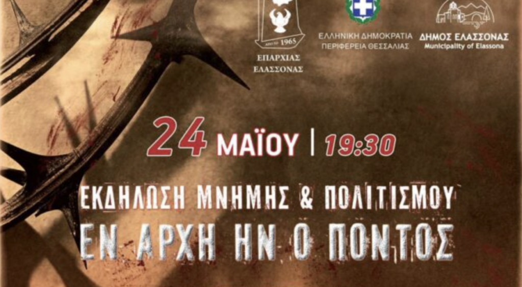 Με ευθύνη απέναντι στην ιστορία που γραφτηκε με τα μελανοτερα γραμματα και με κεντρικα προσωπα τα αδικοχαμενα θυματα μιας θηριωδιας,η Ενωση Ποντιων Επαρχιας Ελασσονας και φετος,σε συνεργασια με την Περιφερεια Θεσσαλιας και τον Δημο Ελασσονας,συνδιοργανωνουν την ΕΚΔΗΛΩΣΗ ΜΝΗΜΗΣ ΚΑΙ ΠΟΛΙΤΙΣΜΟΥ,το Σαββατο 24 Μαιου 2025,στις 7:30 μ.μ,στην Πλατεια Ποντιακου Ελληνισμου,σε μια κορυφαια εκφραση συναισθηματων,αλλα και αγωνιστικων διεκδικησεων,μιας Γενοκτονιας που συντελεστηκε αλλα δεν αναγνωριστηκε ακομα απο τη διεθνη κοινοτητα,παρα απο ελαχιστες χωρες,χαριν των δηθεν γεωπολιτικων ισορροπιων….