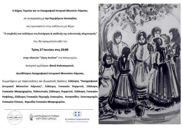 Εκδήλωση με θέμα την «συμβολή των συλλόγων στη διατήρηση και ανάδειξη της πολιτιστικής κληρονομιάς» διοργανώνει ο Δήμος Τεμπών και το Λαογραφικό Ιστορικό Μουσείο Λάρισας, την Τρίτη 27 Ιουνίου στις 20:00 στο Μακρυχώρι.