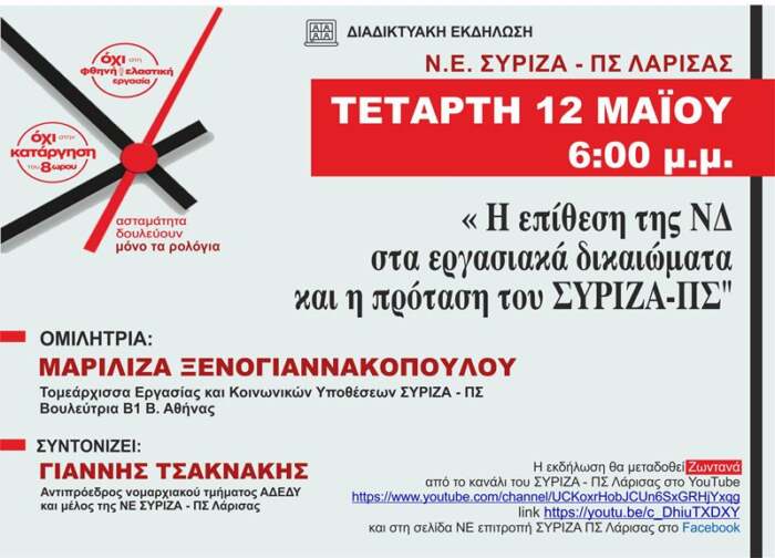 Ο ΣΥΡΙΖΑ – Προοδευτική Συμμαχία Λάρισας διοργανώνει διαδικτυακή εκδήλωση με θέμα «Η επίθεση της ΝΔ στα εργασιακά δικαιώματα και η πρόταση του ΣΥΡΙΖΑ -ΠΣ», σήμερα Τετάρτη 12 Μαίου 2021 στις 6 το απόγευμα.