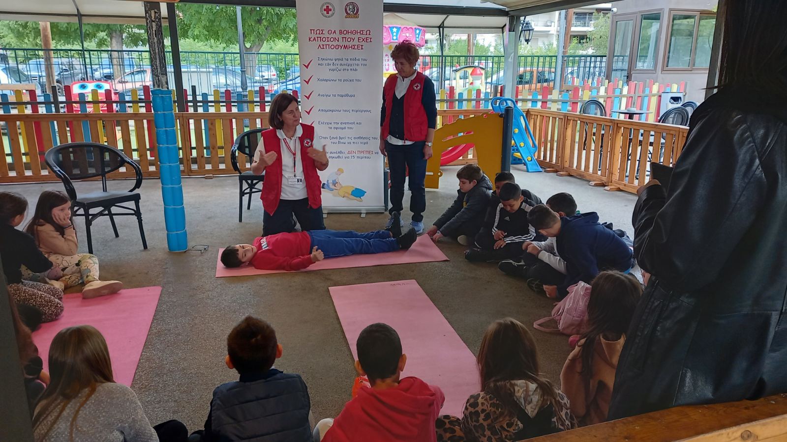 Α. Εκπαιδευτική δράση για μαθητές/τριες Γ΄ και Δ΄ Δημοτικού με τίτλο: «Γίνε Ήρωας Πρώτων Βοηθειών – Μικροί και Μεγάλοι Σώζουν Ζωές», με στόχο την επαφή με τις βασικές αρχές Πρώτων Βοηθειών με διαδραστικό και ψυχαγωγικό τρόπο. Δομή Προγράμματος: 1. Εισαγωγική Παρουσίαση από τον Ερυθρό Σταυρό με απλό και κατανοητό λόγο, διανθισμένη με ερωτήσεις/κουίζ. 2. Βιωματικοί Σταθμοί (4×15’ σε κυκλική ροή). Σταθμός Α: «Δέσιμο Σαν Ήρωας» – Μαθαίνουμε να περιποιούμαστε τραύματα. Σταθμός Β: «Σωστή Κλήση – 166» – Παιχνίδι ρόλων για σωστή επικοινωνία με τις υπηρεσίες. Σταθμός Γ: «Μπουκιά SOS!» – Εκπαίδευση σε πνιγμονή και Heimlich. Σταθμός Δ: «Σώσε το Αρκουδάκι!» – Εκμάθηση βασικών κινήσεων ΚΑΡΠΑ.