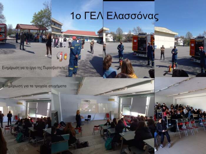 Η Διεύθυνση και ο Σύλλογος Διδασκόντων του 1ου Γενικού Λυκείου Ελασσόνας προάγει την υλοποίηση δράσεων με σκοπό την ενημέρωση των μαθητών που φοιτούν στο σχολείο. Ύστερα από σχετική απόφαση του συλλόγου διδασκόντων, η Διεύθυνση του σχολείου συνεργάστηκε με φορείς της πόλης , συγκεκριμένα με το Αστυνομικό Τμήμα Ελασσόνας και την Πυροσβεστική Υπηρεσία Ελασσόνας , και ύστερα από σχετική πρόσκληση διοργανώθηκαν οι παρακάτω δράσεις.