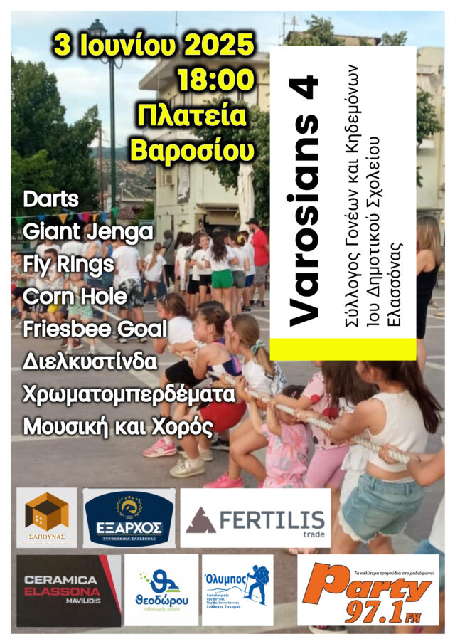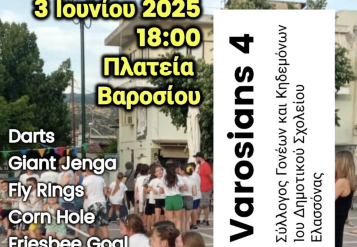 Μια ακόμη χρονιά φτάνει στο τέλος της και θα πρέπει να την αποχαιρετίσουμε με τον καλύτερο δυνατό τρόπο!!! Ο Σύλλογος Γονέων και Κηδεμόνων 1ου Δημοτικού Σχολείου Ελασσόνας πιστός στο ραντεβού του με το δημιουργικό παιχνίδι, για φέτος σχεδίασε και θα υλοποιήσει τα 4α Varosians Games στην πλατεία του Βαροσίου την Τρίτη 03/06/2025. Η εκδήλωση θα πραγματοποιηθεί το απόγευμα στις 18.00 και είναι αφιερωμένη στα παιδιά μας. Τα παιδιά του 1ου Δημοτικού Σχολείου Ελασσόνας. Η εκδήλωση θα περιλαμβάνει παιχνίδια δεξιοτήτων – πολυδραστηριότητες πολλαπλών επιλογών με κυκλική συμμετοχή όπως: