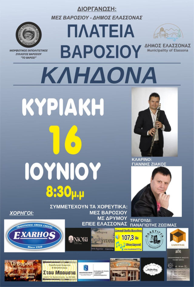 Ο Δήμος Ελασσόνας και ο Μορφωτικός Εκπολιτιστικός Σύλλογος Βαροσίου, αναβιώνουν και φέτος το έθιμο του «Κλήδονα» σήμερα Κυριακή 16 Ιουνίου 2024 και ώρα 20:30 μ.μ. στη πλατεία Βαροσίου στην Ελασσόνα, στη συνοικία Αμπελοκήπων.