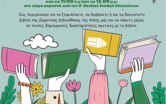 Την Κυριακή 2 Απριλίου «Παγκόσμια ημέρα παιδικού βιβλίου» ο Δήμος Ελασσόνας και η Ομάδα Εθελοντών «Πάμε Βιβλιοθήκη» σας προσκαλούν από τις 11:00 έως τις 13:00 στο χώρο μπροστά από τον Β΄ Παιδικό Σταθμό Ελασσόνας, στην πλατεία Εθνικής Αντιστάσεως, για να ξεφυλλίσετε, να διαβάσετε ή και να δανειστείτε βιβλία της Δημοτικής βιβλιοθήκης της πόλης μας και να πάρετε μέρος σε πολλές δημιουργικές δραστηριότητες σχετικές με το βιβλίο. Η εκδήλωση απευθύνεται σε παιδιά δημοτικού.
