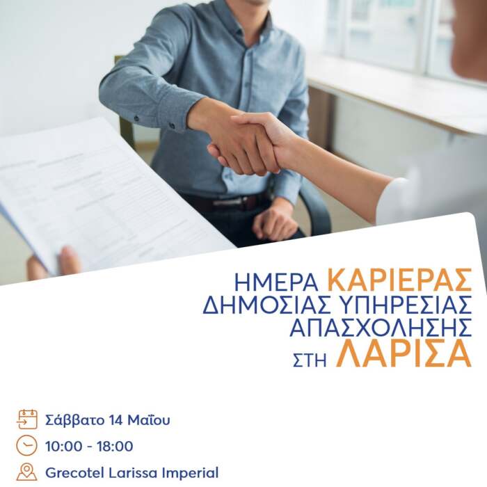 Το Σάββατο 14 Μαΐου η Δημόσια Υπηρεσία Απασχόλησης (Δ.ΥΠ.Α., πρώην Ο.Α.Ε.Δ.) διοργανώνει εκδήλωση “Ημέρα Καριέρας” στο ξενοδοχείο Grecotel Larissa Imperial στη Λάρισα (Φαρσάλων 182, ΤΚ 41335) από τις 10:00 έως τις 18:00. Κατά τη διάρκεια της εκδήλωσης οι ενδιαφερόμενοι θα μπορούν να μιλήσουν απ’ ευθείας με εκπροσώπους επιχειρήσεων που αναζητούν προσωπικό.