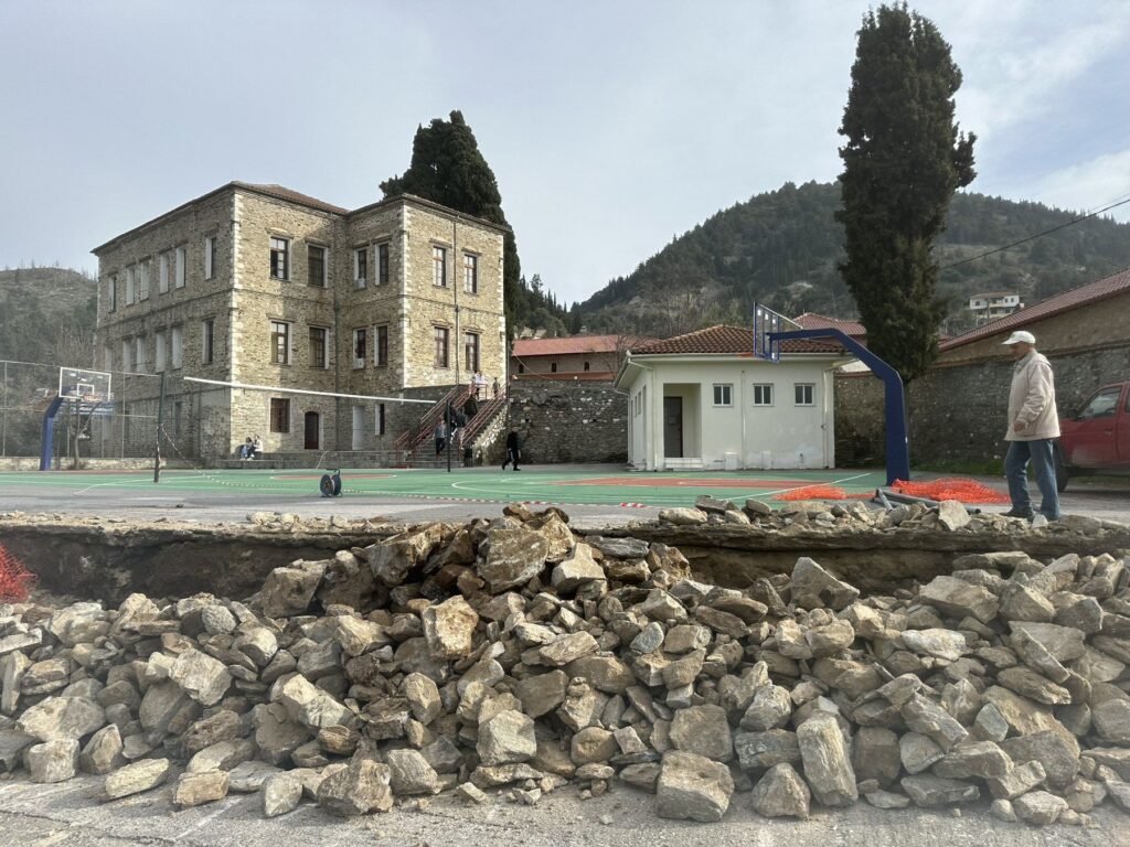 Ξεκίνησαν την περασμένη Τρίτη οι εργασίες αποκατάστασης του παλαιού πέτρινου τοιχίου αντιστήριξης στο προαύλιο της Οικονομείου Σχολής στην Τσαριτσάνη.