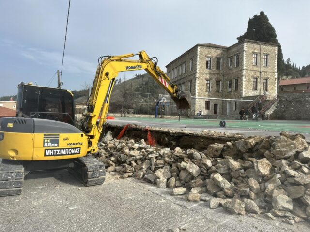 Ξεκίνησαν την περασμένη Τρίτη οι εργασίες αποκατάστασης του παλαιού πέτρινου τοιχίου αντιστήριξης στο προαύλιο της Οικονομείου Σχολής στην Τσαριτσάνη.