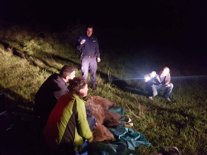 Το ζώο εντοπίστηκε το απόγευμα της 6ης Μαΐου από διερχόμενο βοσκό ο οποίος ειδοποίησε την Ζ’ Κυνηγετική Ομοσπονδία. Η Ομοσπονδία ενημέρωσε το Εργαστήριο Μικροβιολογίας και Παρασιτολογίας του Τμήματος Κτηνιατρικής του Πανεπιστημίου Θεσσαλίας. Oι επιστήμονες του εργαστηρίου ενημέρωσαν την Περιβαλλοντική Οργάνωση «Καλλιστώ» με την οποία συνεργάζονται στα έργα LIFE ARCPROM και LIFE Bear Smart Corridors για την καφέ αρκούδα. Οι κτηνίατροι Δημήτρης Χατζόπουλος και Γιώργος Χαστάς μαζί με στέλεχος της «Καλλιστώ», μετά από την άδεια και την συνδρομή του Δασαρχείου Λάρισας, και με την παρουσία στελεχών της Θηροφυλακής και της Αστυνομίας λειτούργησαν στον πλαίσιο του πρωτοκόλλου για την αντιμετώπιση περιστατικών αλληλεπίδρασης ανθρώπου και αρκούδας, όπως προβλέπεται από την ισχύουσα νομοθεσία (ΦΕΚ 272/Β/07-02-2014).