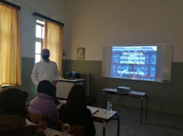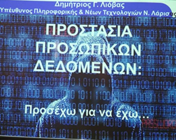 Η εκδήλωση πραγματοποιήθηκε με μεγάλη επιτυχία την Πέμπτη 31 Μαρτίου, και ομιλητής της ήταν ο Καθηγητής Πληροφορικής και Υπεύθυνος Πληροφορικής και Νέων Τεχνολογιών Β/θμιας Εκπαίδευσης Ν. Λάρισας κ. Δημήτριος Γ. Λιόβας, ο οποίος, αφού τόνισε τη χρησιμότητα και την αξία του Διαδικτύου στη σημερινή εποχή, επισήμανε τους αυξημένους κινδύνους που εγκυμονεί η αλόγιστη & απρόσεκτη χρήση του, ενώ αναφέρθηκε επιγραμματικά και στο θεσμικό πλαίσιο προστασίας των προσωπικών δεδομένων (GDPR). Στη συνέχεια, παρουσίασε τρόπους προστασίας των προσωπικών δεδομένων των μαθητών, με τη βοήθεια ενημερωτικών βίντεο, χρήσιμων συμβουλών – οδηγιών, αλλά και εξειδικευμένου εκπαιδευτικού υλικού, το οποίο τέθηκε στη διάθεση των μαθητών, των γονέων τους και των εκπαιδευτικών του σχολείου.