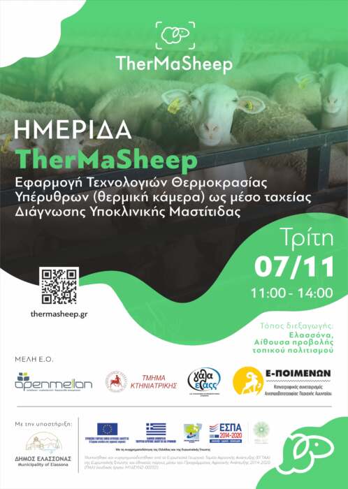 Το εταιρικό σχήμα του έργου «TherMaSheep – Εφαρμογή Τεχνολογιών Θερμοκρασίας Υπέρυθρων (θερμική κάμερα) ως μέσο ταχείας Διάγνωσης Υποκλινικής Μαστίτιδας: Βελτίωση ευζωίας και δεικτών παραγωγής σε αιγοπροβατοτροφικές εκμεταλλεύσεις» σας προσκαλεί την Τρίτη 7 Νοεμβρίου στην πρώτη ενημερωτική ημερίδα του έργου, η οποία θα πραγματοποιηθεί στην Ελασσόνα, στην Αίθουσα Προβολής Τοπικού Πολιτισμού.