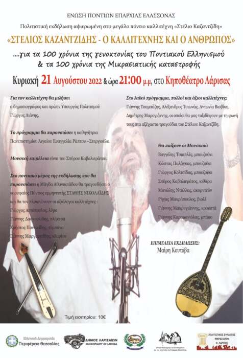 Η Ένωση Ποντίων Επαρχίας Ελασσόνας, στο πλαίσιο των 100 χρόνων από τη Γενοκτονία του Ποντιακού Ελληνισμού και των 100 χρόνων της Μικρασιατικής Καταστροφής, διοργανώνει πολιτιστική μουσικοχορευτική εκδήλωση, με συνδιοργανωτές την Περιφέρεια Θεσσαλίας, τον Δήμο Λάρισας, τους Μικρασιάτες Λάρισας, τον Δήμο Ελασσόνας και το «Δίκτυο Καλλιτεχνών και Επιστημόνων»