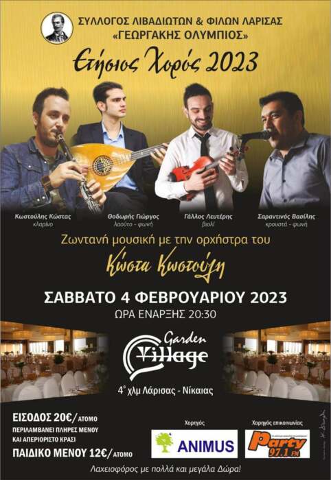 Ο ετήσιος χορός του Συλλόγου Λιβαδιωτών και Φίλων Λάρισας «Γεωργάκης Ολύμπιος» πλησιάζει και θα πραγματοποιηθεί το Σάββατο 4 Φεβρουαρίου 2023 στις 8.30 μ.μ. στο Garden Village (4ο χλμ Λάρισας – Νίκαιας).