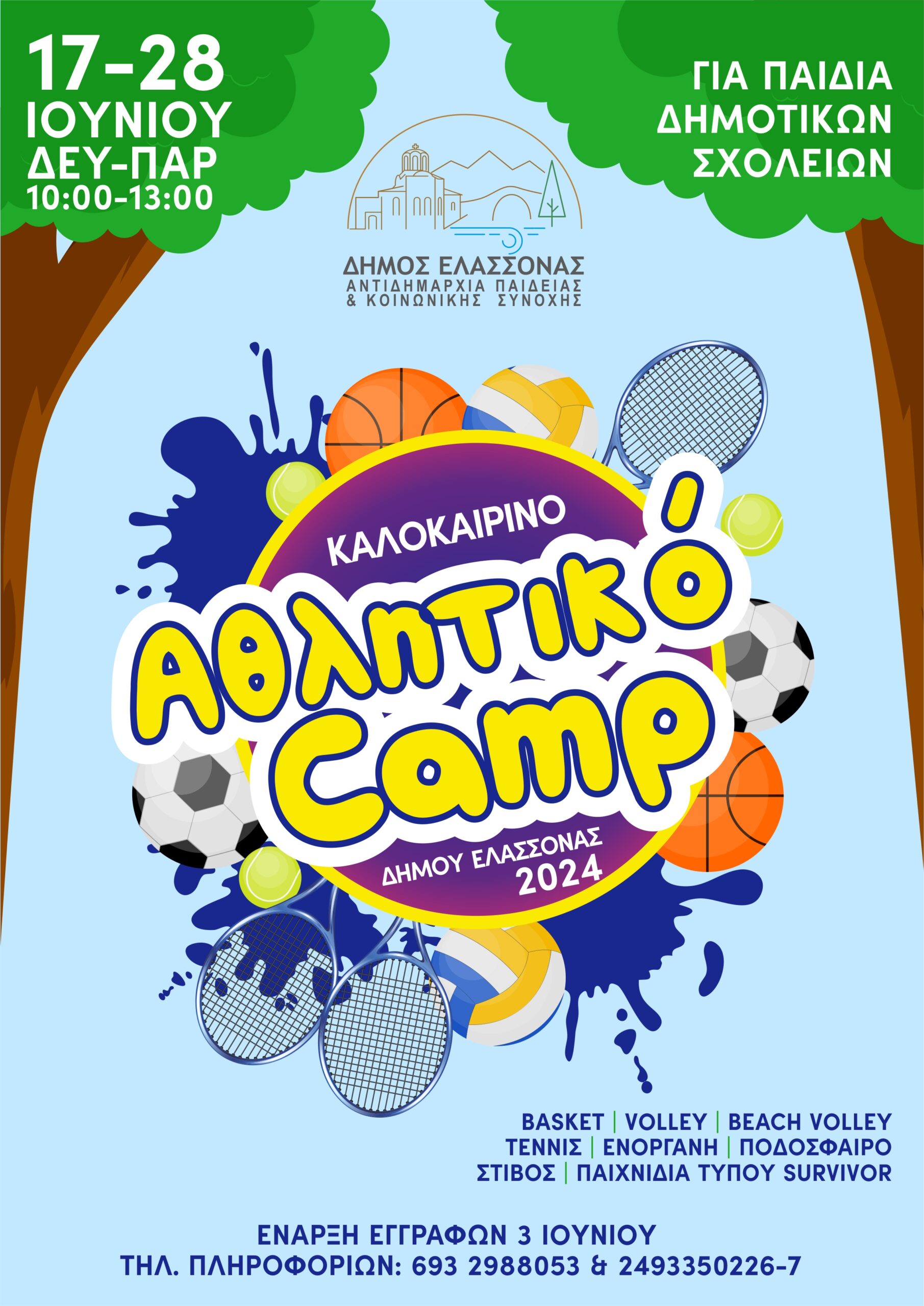 «Αθλητικό Camp» για παιδιά δημοτικού υλοποιεί για 2η συνεχόμενη χρονιά ο Δήμος Ελασσόνας μέσω της Αντιδημαρχίας Παιδείας και Κοινωνικής Συνοχής, μετά τη λήξη της σχολικής χρονιάς και συγκεκριμένα από την Δευτέρα 17/6/2024 μέχρι και την 28/6/2024.