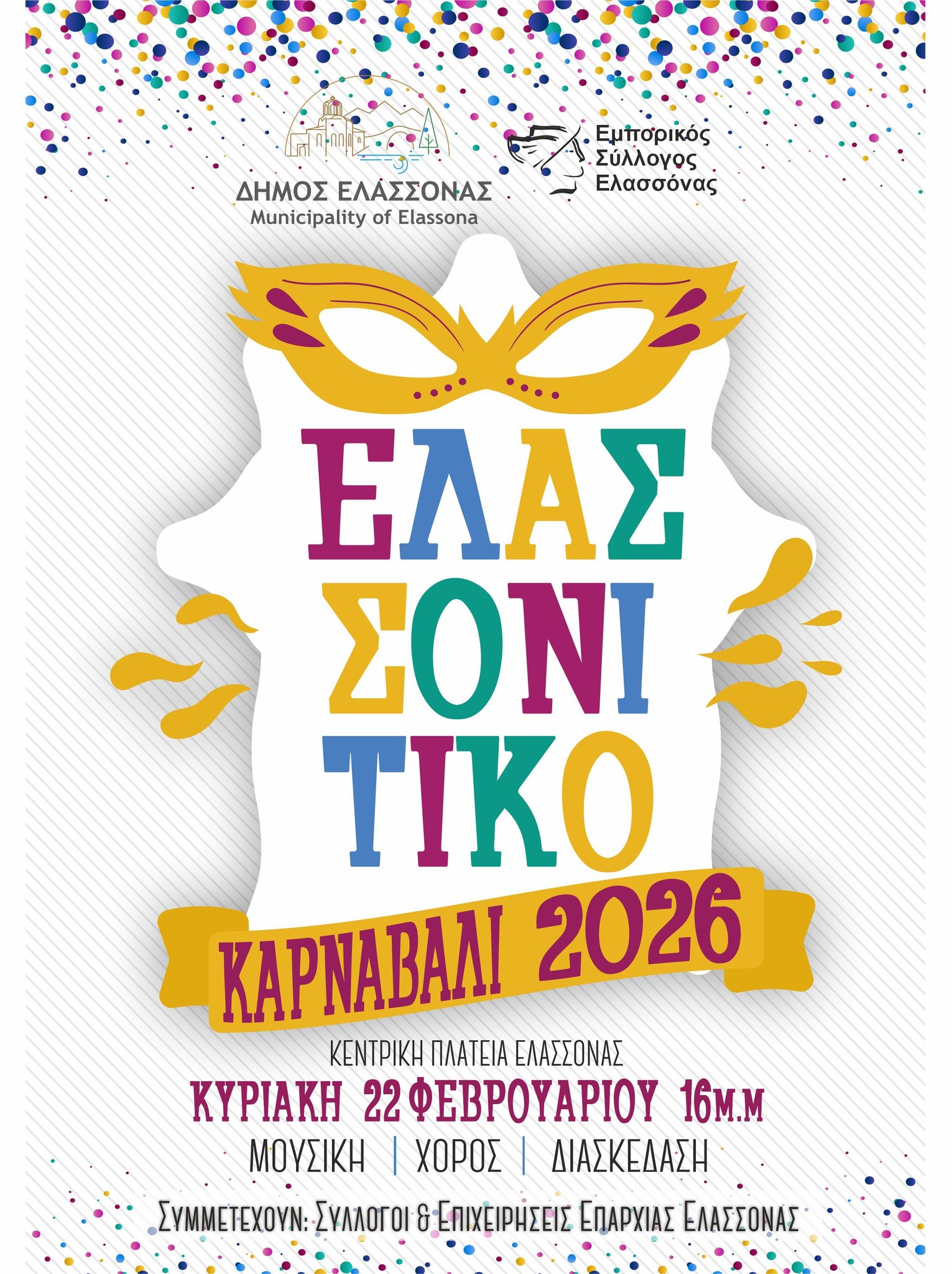 Το Ελασσονίτικο Καρναβάλι 2026 έρχεται από τον Δήμο Ελασσόνας και υπόσχεται την Κυριακή 22 Φεβρουαρίου 4 μ.μ. να βάλει …φωτιά στην Κεντρική Πλατεία με Μουσική, χορός και πολλή διασκέδαση!