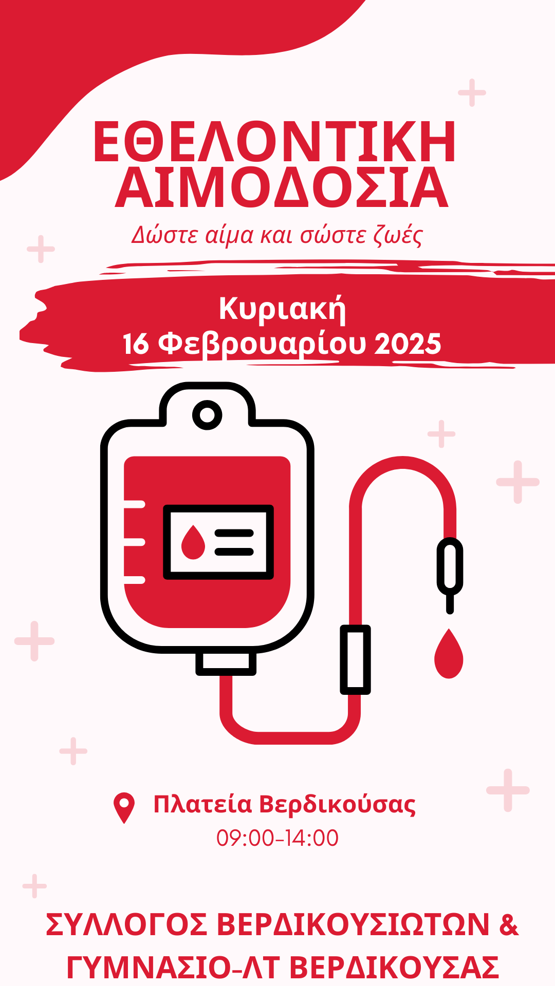 Το Γυμνάσιο Λ.Τ Βερδικούσας σε συνεργασία με τον Σύλλογο Βερδικουσιωτών διοργανώνουν την Κυριακή 16 Φεβρουαρίου 2025, από τις 9:00 μέχρι τις 14:00, εθελοντική αιμοδοσία στην πλατεία του χωριού, στο πλαίσιο του πανελλήνιου σχολικού διαγωνισμού Δράσης Εθελοντικής Αιμοδοσίας με τίτλο “ΣΧΟΛΕΙΑ – ΓΕΦΥΡΕΣ ΖΩΗΣ” του εκπαιδευτικού οργανισμού Ορίζοντες. Η δράση αυτή αποσκοπεί στην ευαισθητοποίηση της μαθητικής και ευρύτερης κοινότητας για τη σημασία της εθελοντικής αιμοδοσίας.